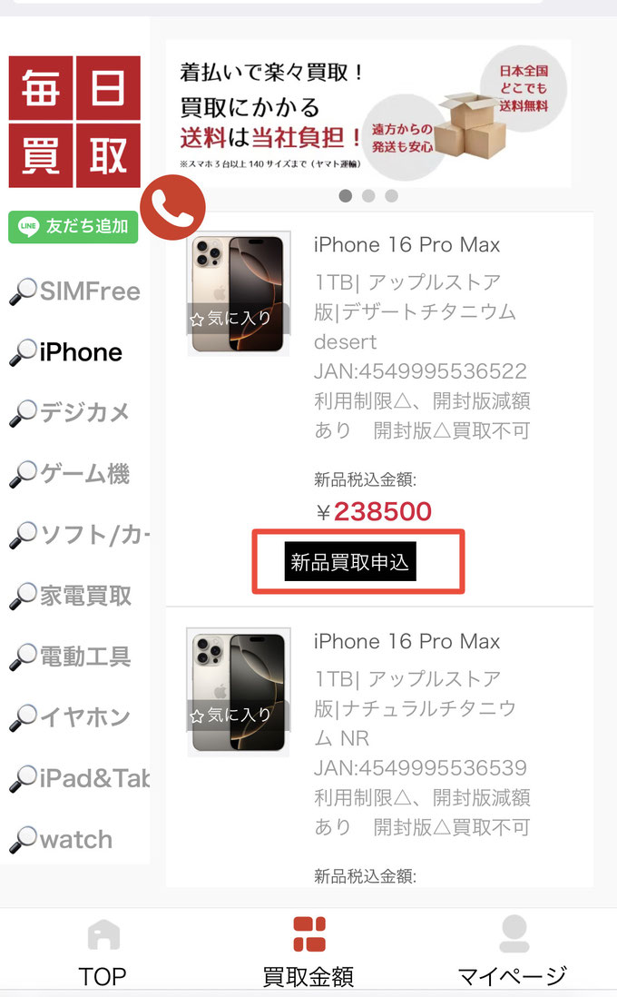 ※店舗到着、商品検品後に買取申し込みをしてください。